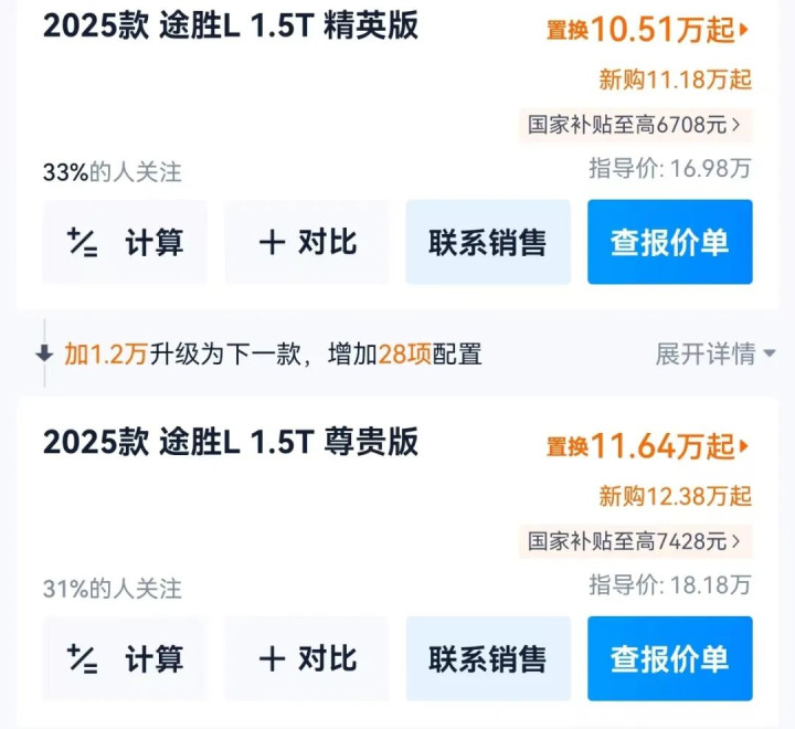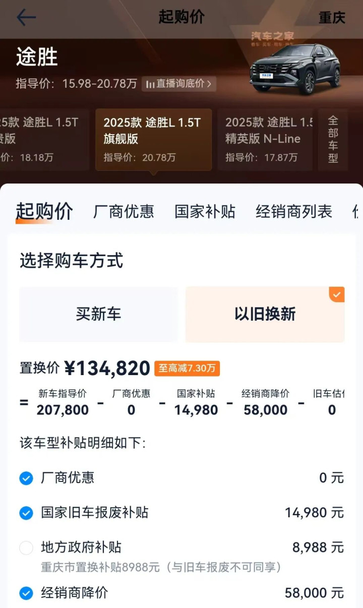 我在汽车平台上看到,以咫尺销量最大的2025款途胜L 1.5T旗舰版为例:指点价20.78万、厂商优惠0元、国度旧车报废补贴14980元(2013年之前购买上牌的作报废车)、处所政府补贴8988元(还挑升备提防庆市置换补贴8988元,与旧车报废不能同享),经销商降价58000元。说七说八:置换价134820元(至高减7.3万元)