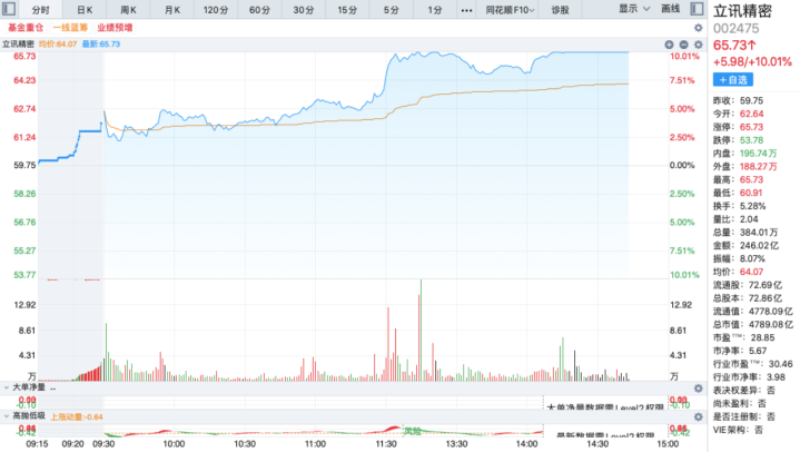 立讯精密当天强势高开,随后全体呈现震憾上行的走势,午后10CM涨停,股价报65.73元/股,总市值为4789.08亿元,截止发稿未掀开涨停板。