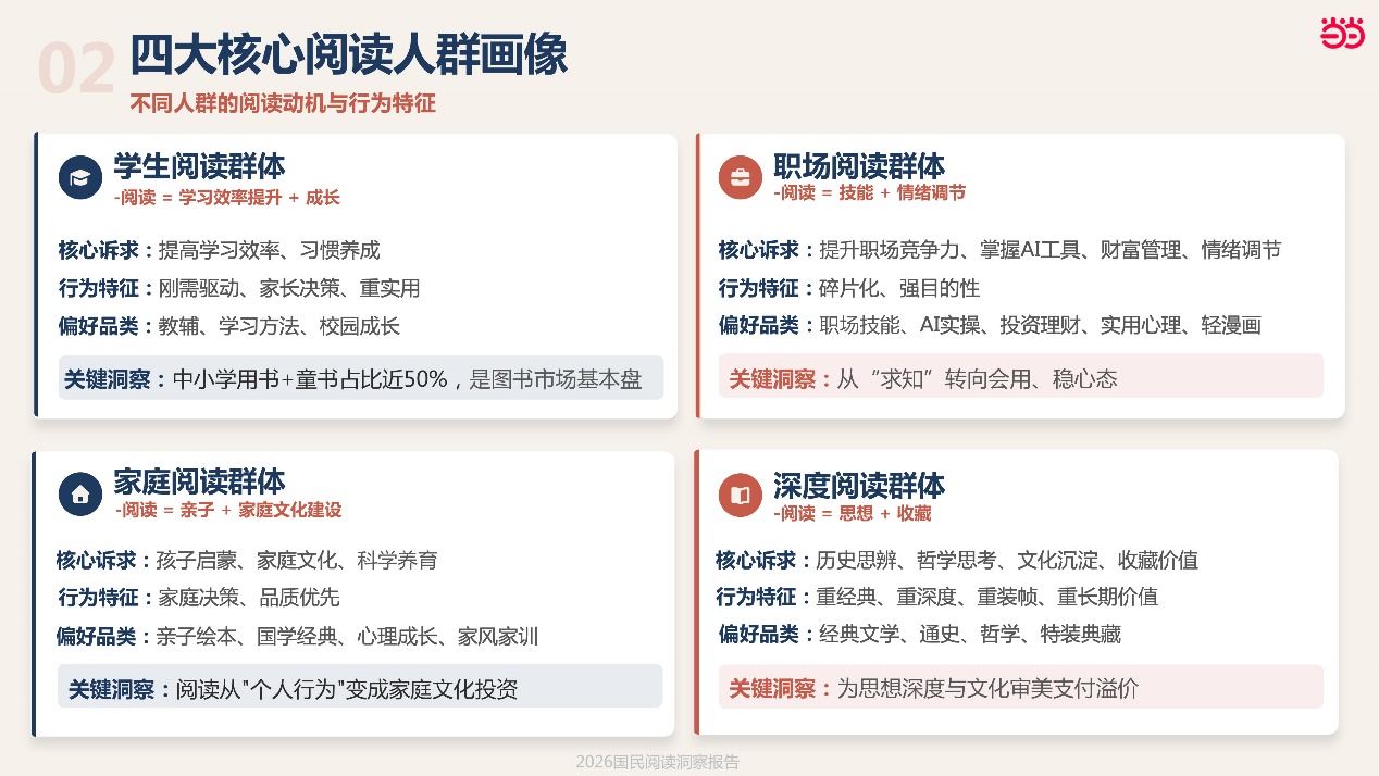 请教通过大数据分析,明确四大阅读中枢东谈主群,各东谈主群需求呈现瓦解互异化特征: