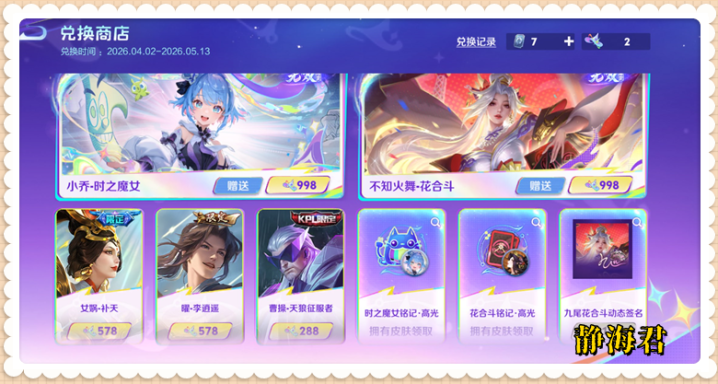 通过无双祈愿返场的:小乔-时之魔女、不知火舞-花合斗、女娲-补天、曜-李浪漫、曹操-天狼投降者。