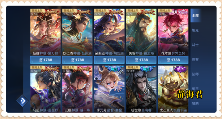 马限皮肤:云缨的神骥-越千峰、马超的神骥-逐星野、关羽的神骥-镇沧海、朵莉亚的神骥-鸣幻洲、狄仁杰的神骥-赴朔漠、狗尾续蝉的神骥-聚万邦。